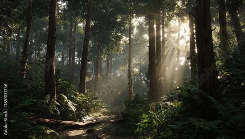 © Danil, Obraz premium Sunbeams piercing a dense, misty forest