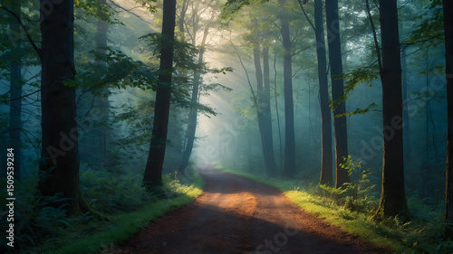 Fototapeta premium Sunbeams Piercing a Misty Forest Path