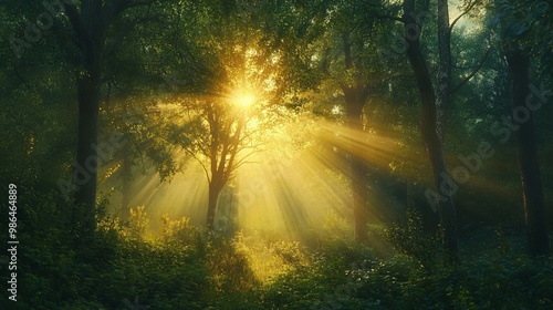 Fototapeta premium Sunbeams Piercing Through a Dense Forest Canopy