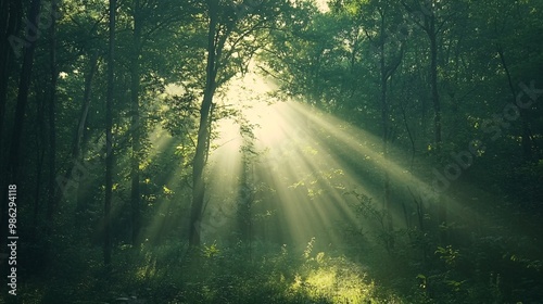 Obraz premium Sunbeams Piercing Through a Dense Green Forest