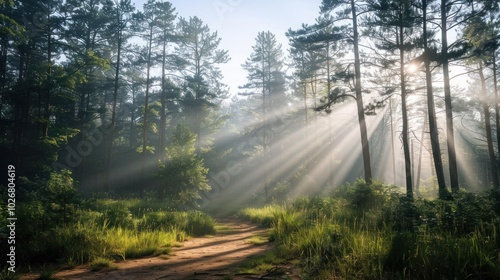 Fototapeta premium Sunbeams Piercing Through a Foggy Forest Path