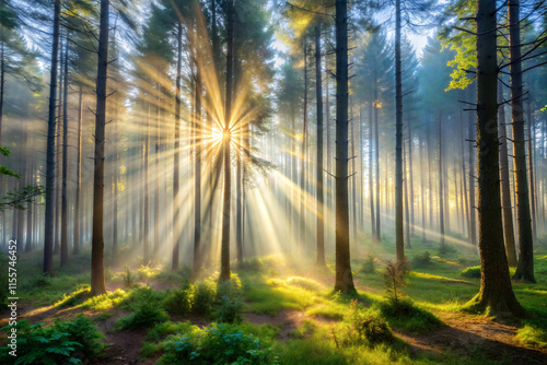 Fototapeta premium Sunbeams Piercing Through a Misty Forest Morning