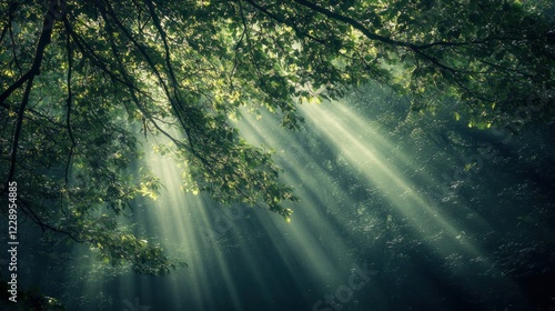 © BerkahStock, Obraz premium Sunbeams piercing through lush forest canopy.