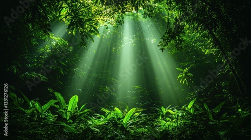 © MUMTAZ, Obraz premium Sunbeams Piercing Through Lush Rainforest Canopy