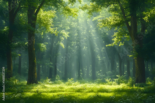 Obraz premium Sunbeams piercing through the canopy of a lush, green forest, il