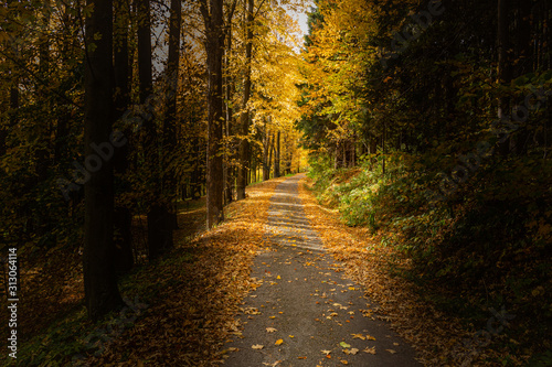 © Roman's portfolio, Naklejka premium Sunbeams pour through trees in forest. Road through a forest with fog
