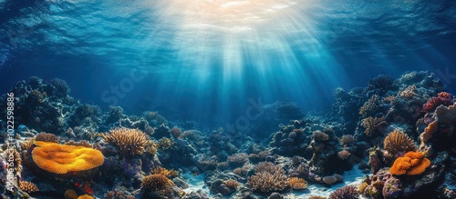 Fototapeta premium Sunbeams shine through clear blue water onto a colorful coral reef.