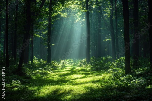 Obraz premium Sunbeams shine through trees in a lush green forest path. Use this serene...