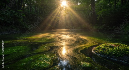 Naklejka premium Sunbeams Shining on an Algae-Covered River, Natural Forest Ecosystem and...
