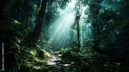 Fototapeta premium Sunbeams shining through a dark and mysterious forest path.