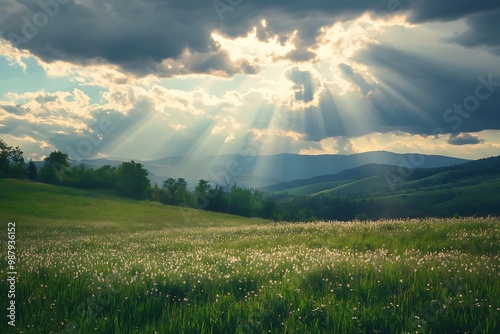 Obraz premium Sunbeams shining through clouds over a grassy field and hills in a beautiful...