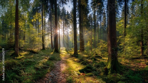 © Naeem, Fototapeta premium Sunbeams shining through panoramic forest landscape with tall trees