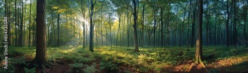 © ArtCookStudio, Obraz premium Sunbeams Shining Through Tall Trees in a Lush Green Forest