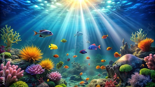 Naklejka premium Sunbeams shining through the deep sea background with underwater plants and colorful fish, sunbeams, sea, ocean, underwater