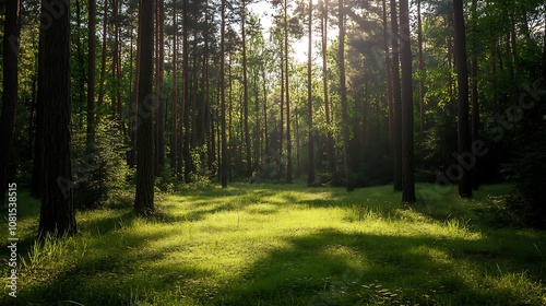 Fototapeta premium Sunbeams shining through the trees in a lush green forest