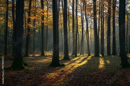 © atar, Fototapeta premium Sunbeams Shining Through the Trees in Autumn Forest