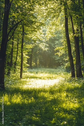 Fototapeta premium Sunbeams shining through trees in a lush green forest