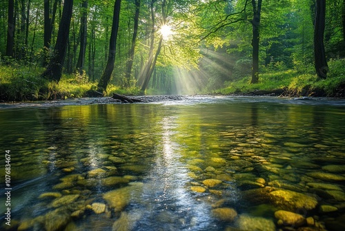 © novian, Obraz premium Sunbeams Shining Through Trees Onto a Tranquil River