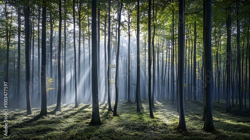 © bcendet, Obraz premium Sunbeams stream through a dense, misty forest, illuminating the trunks of the trees.