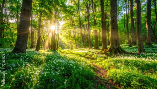© Thamrin, Obraz premium Sunbeams stream through a vibrant, green forest, illuminating a tranquil path