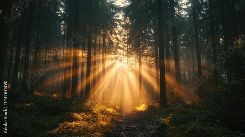 © Digital Artist, Fototapeta premium Sunbeams streaming down in a dark forest, creating a mystical and magical glow.