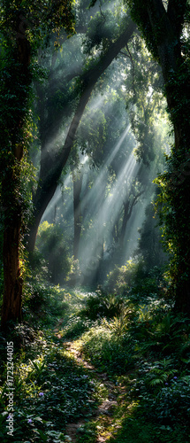 © john, Obraz premium Sunbeams Streaming Through Lush Green Forest