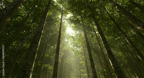 © Yassine DS, Fototapeta premium Sunbeams streaming through lush green forest canopy from low angle perspective, natural lighting in deciduous woodland