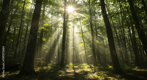 Obraz premium Sunbeams Streaming Through Misty Forest, Magical Sunlight in Green Woods