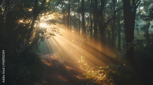 Obraz premium Sunbeams Streaming Through Misty Forest Path