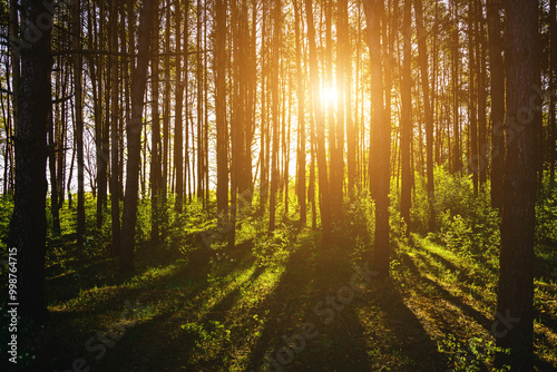 Fototapeta premium Sunbeams streaming through the pine trees and illuminating the young green...
