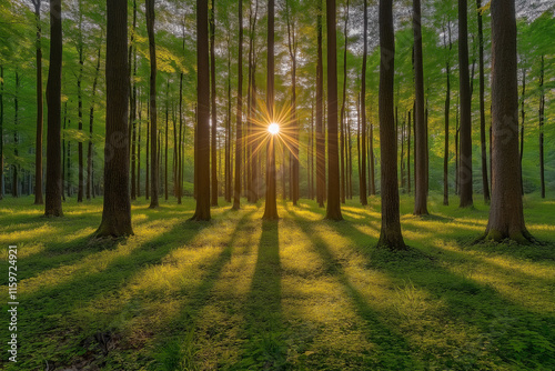 © Luminous Visions, Fototapeta premium Sunbeams through a lush green forest, creating a magical atmosphere.