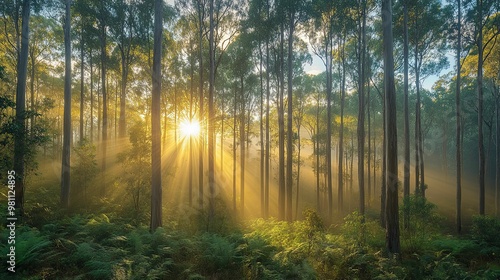 Naklejka premium Sunbeams Through a Misty Eucalyptus Forest