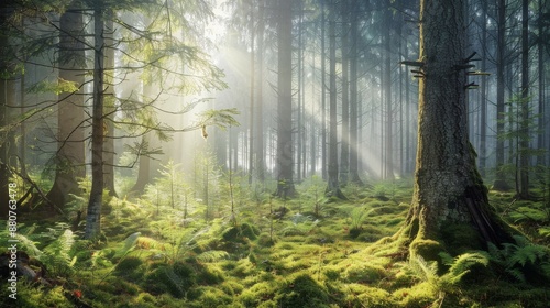 © benjamas, Fototapeta premium Sunbeams through a Misty Forest.
