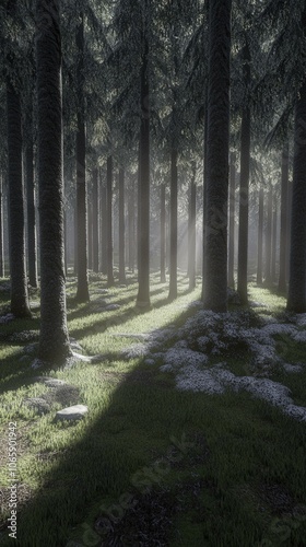 © Desert Maker, Fototapeta premium Sunbeams Through a Misty Forest - Nature Photography