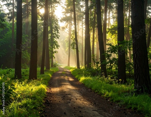 Obraz premium Sunbeams through a misty forest path