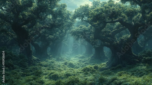 © raja, Fototapeta premium Sunbeams Through a Misty Forest Path