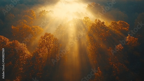 © Enggal Pitoyo, Fototapeta premium Sunbeams through autumn forest at dawn. Nature wallpaper