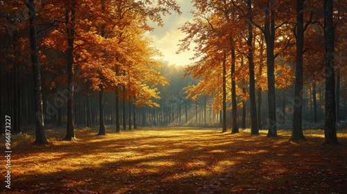 © raja, Obraz premium Sunbeams Through Autumn Trees in a Forest Clearing