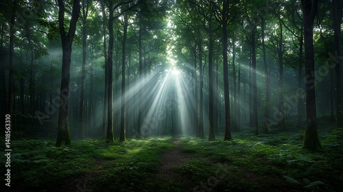 Obraz premium Sunbeams through dense, lush forest. A path leads through towering trees