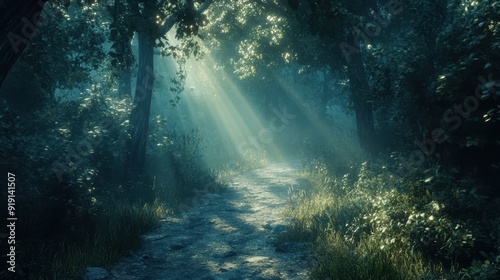 Fototapeta premium Sunbeams Through Foggy Forest Path, Magical Nature Scene.