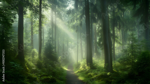 Obraz premium Sunbeams Through Foggy Forest Path - Nature Photography