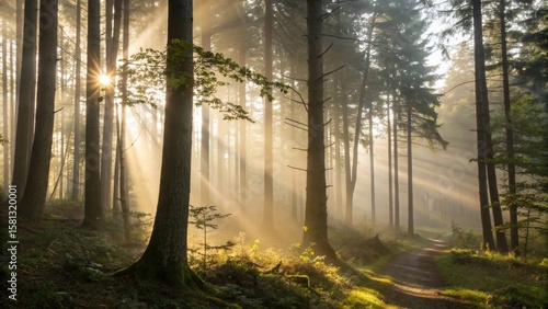 Obraz premium Sunbeams Through Forest A Serene Morning Walk with Soft Mist in the Woods