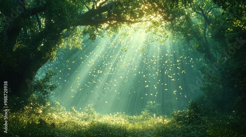 © Jiranath, Obraz premium Sunbeams Through Forest Canopy