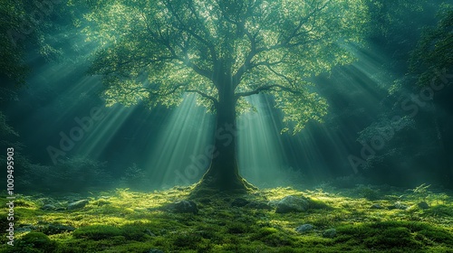 © Plumeria, Fototapeta premium Sunbeams Through Forest Canopy - Nature Photography