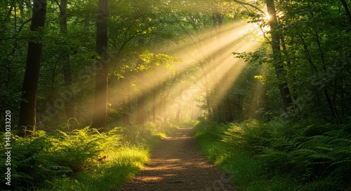 Fototapeta premium Sunbeams Through Forest Path - Serene forest path bathed in magical sunlight, symbolizing peace, tranquility, nature's beauty, hope, and new beginnings