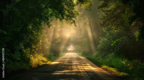 © SebuahKisah, Obraz premium Sunbeams Through Forest Road.
