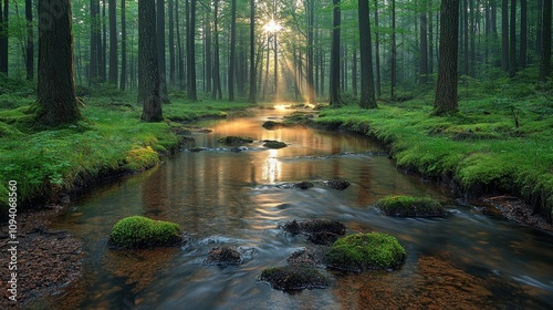 © Muamanah, Obraz premium Sunbeams Through Forest Stream
