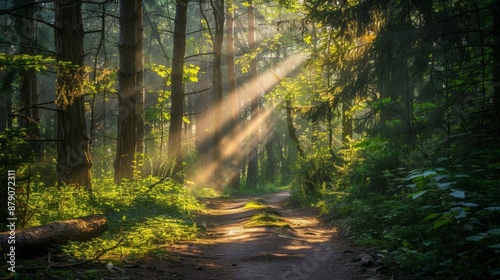 © amorn_m, Obraz premium Sunbeams Through Forest Trees.