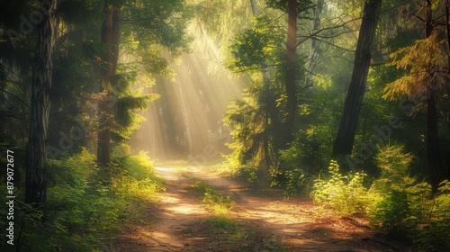 © amorn_m, Obraz premium Sunbeams Through Forest Trees.
