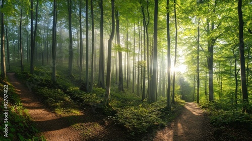© Nas, Naklejka premium Sunbeams Through Forest Trees